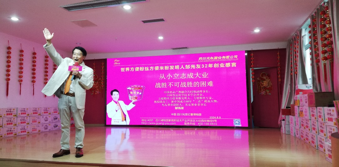 活動前預(yù)熱環(huán)節(jié),一段活力四射的光友粉絲舞視頻讓現(xiàn)場氣氛瞬間升溫。隨后,方便粉絲方便米粉發(fā)明人、光友薯業(yè)集團董事長鄒光友發(fā)表熱情洋溢的歡迎辭,并深情分享《從小立志成大業(yè) 戰(zhàn)勝不可戰(zhàn)勝的困難》的感言,鼓勵小記者們勇于面對挑戰(zhàn)面對困難,追求夢想。在互動環(huán)節(jié),小記者們積極提問,鄒董事長一一耐心解答,并親手為提問的小記者們贈送《光友詩選》,每本書上都附有鄒董事長親筆簽名及溫馨寄語,傳遞著對下一代的殷切期望。