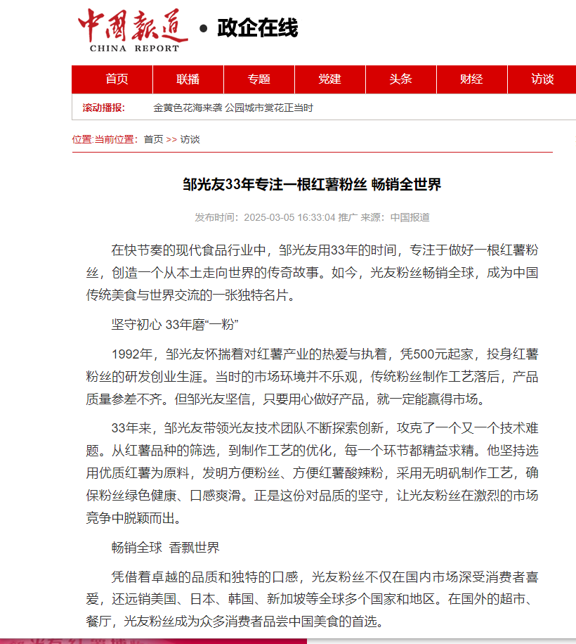 轉(zhuǎn)載中國報(bào)道網(wǎng)——鄒光友33年專注一根紅薯粉絲 暢銷全世界