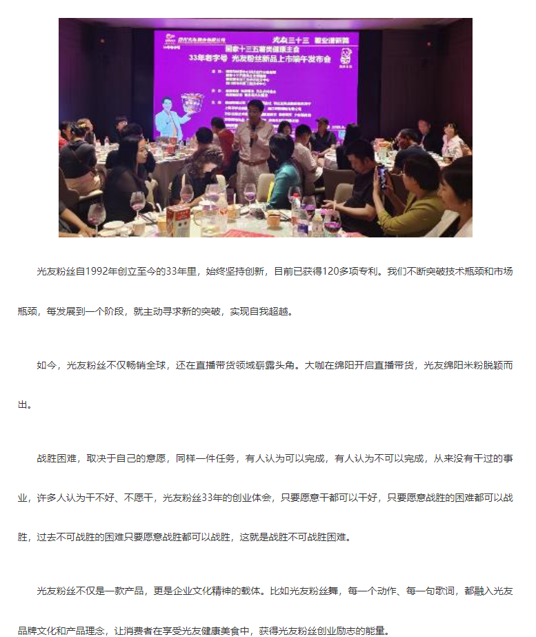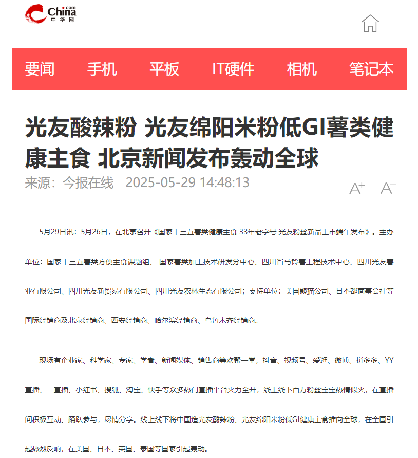 轉(zhuǎn)載中華網(wǎng)——光友酸辣粉 光友綿陽(yáng)米粉低GI薯類(lèi)健康主食 北京新聞發(fā)布轟動(dòng)全球