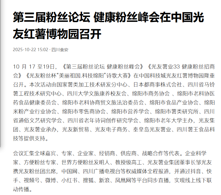 轉載四川食安今日頭條-第三屆粉絲論壇 健康粉絲峰會在中國光友紅薯博物園召開
