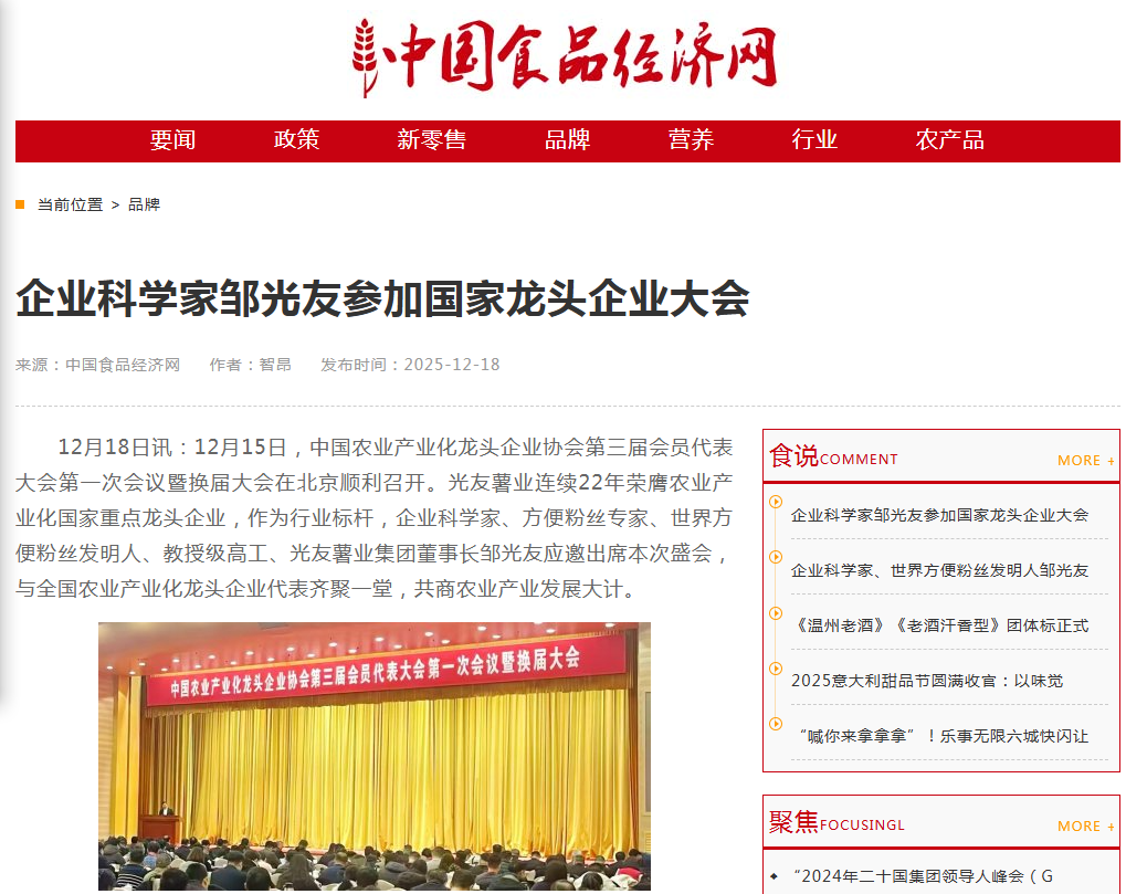 轉(zhuǎn)載中國食品經(jīng)濟網(wǎng)-企業(yè)科學家鄒光友出席國家龍頭企業(yè)大會