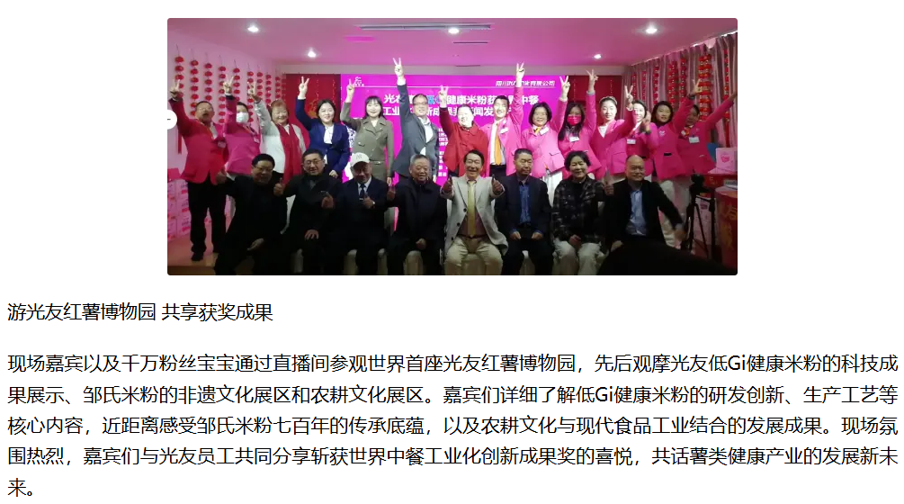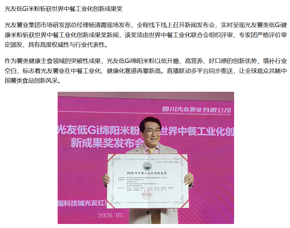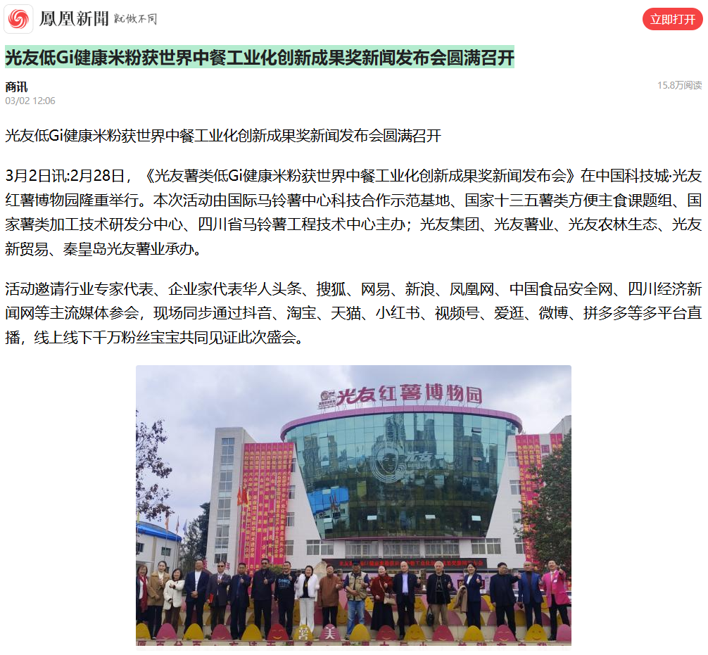 轉(zhuǎn)載鳳凰網(wǎng):光友低Gi健康米粉獲世界中餐工業(yè)化創(chuàng)新成果獎(jiǎng)新聞發(fā)布會(huì)圓滿(mǎn)召開(kāi)